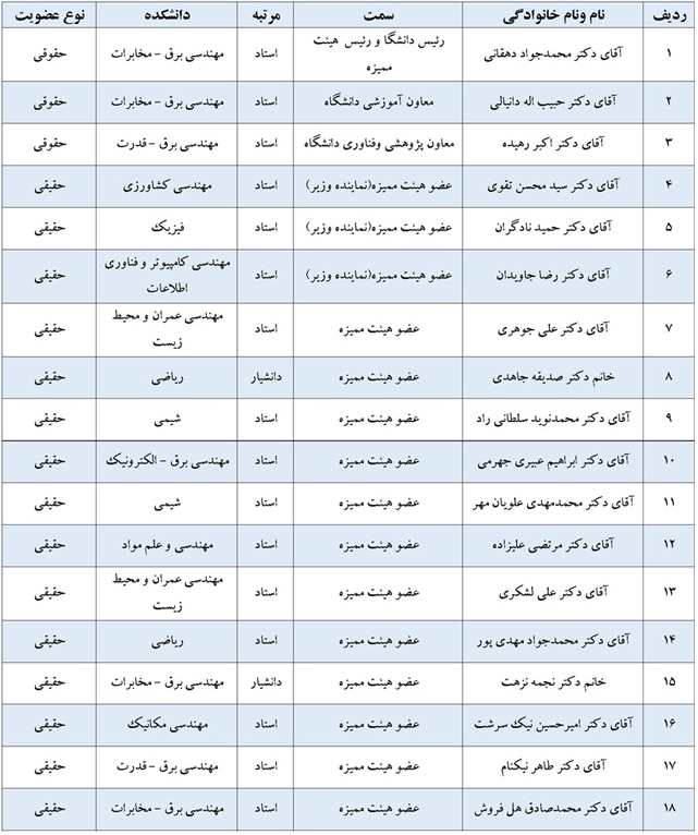 به گزارش روابط عمومی دانشگاه، با حکم وزیر علوم، تحقیقات و فناوری، اعضای دوره دوم هیئت ممیزه دانشگاه صنعتی شیراز منصوب شدند. این هیئت متشکل از ۱5 عضو حقیقی و ۳ عضو حقوقی، برای یک دوره دو ساله مسئولیت ارزیابی و تأیید درخواستهای ارتقای مرتبه، پایه های تشویقی و احتساب سنوات خدمت پیمانی اعضای هیئت علمی دانشگاه را بر عهده خواهد داشت. ترکیب اعضای حقوقی و حقیقی این دوره به شرح زیر است: